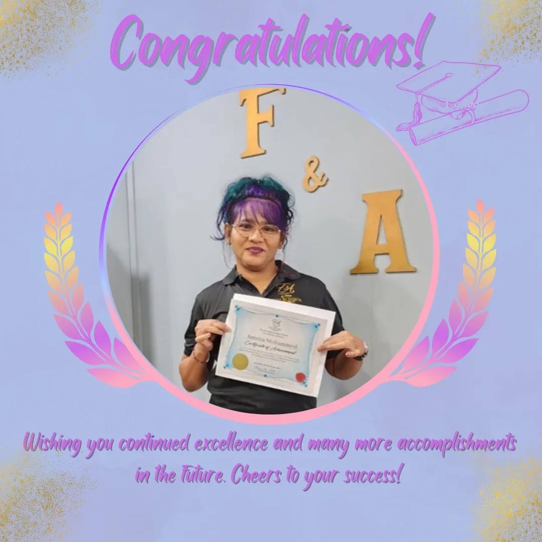 I have done a number of courses with F&A Salon,Spa and school and was really amazed by the level of information that was given by the tutor. She also has a very benign personality which makes learning so easy for the student.